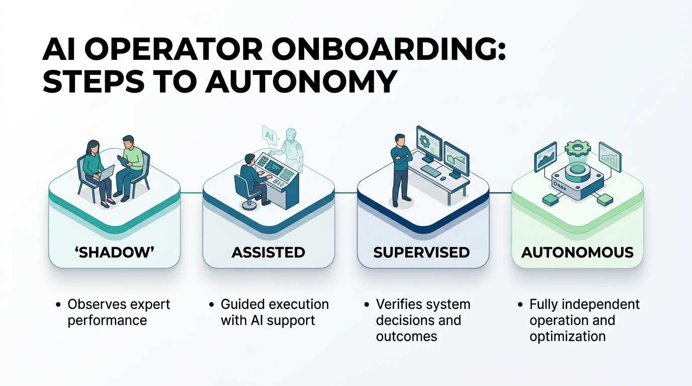 A week-by-week playbook for onboarding AI operators into your team. Shadow mode through autonomous operation, building team trust, and avoiding the common failure modes.